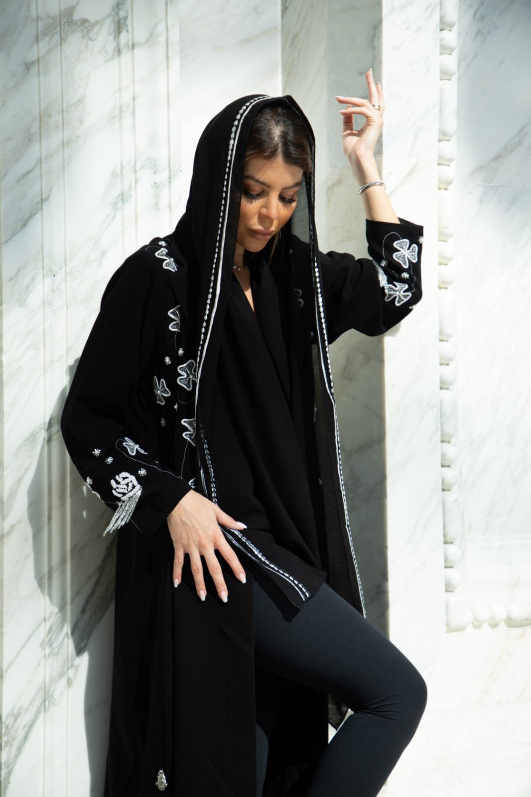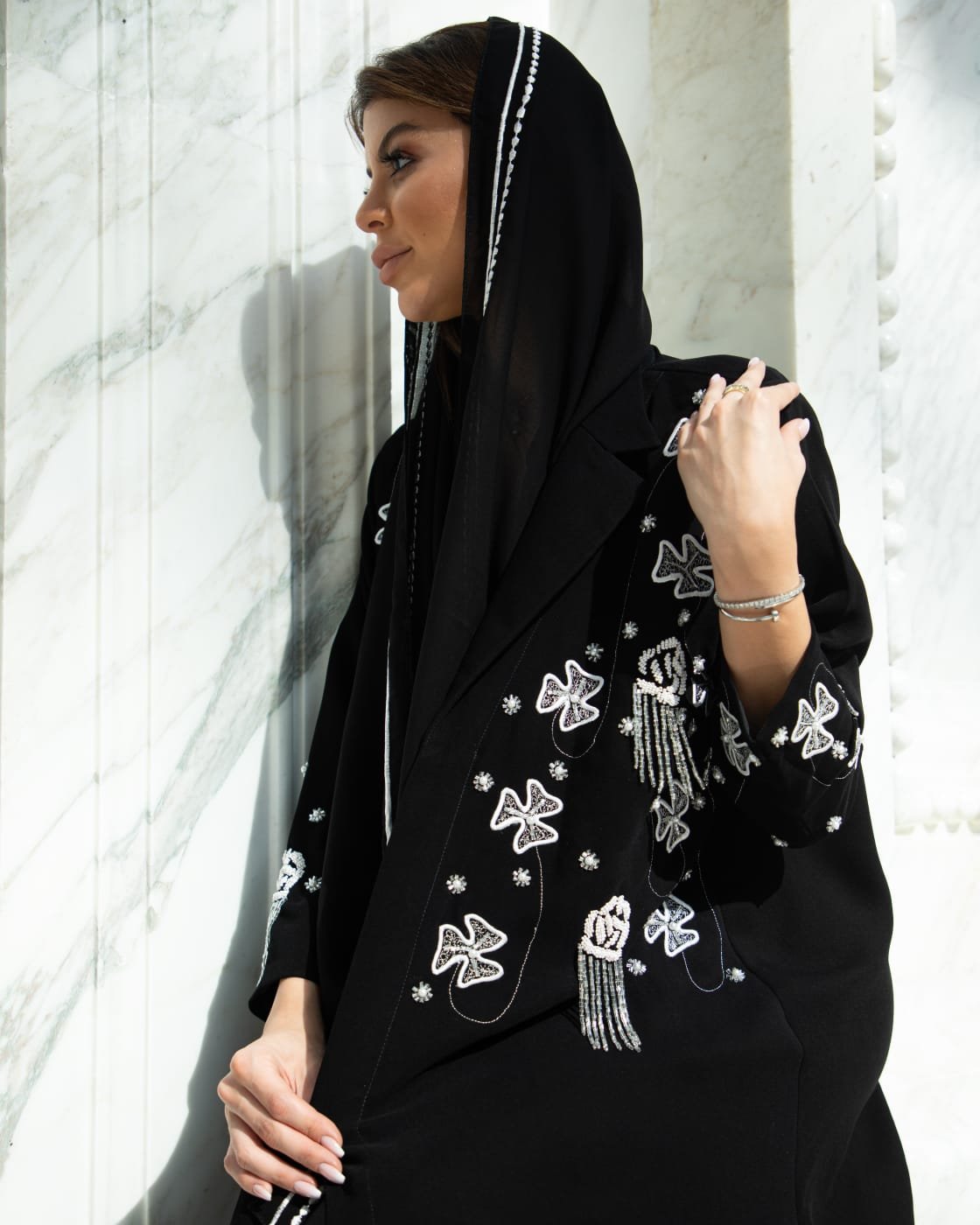 A luxurious abaya crafted from premium charcoal ceramic fabr