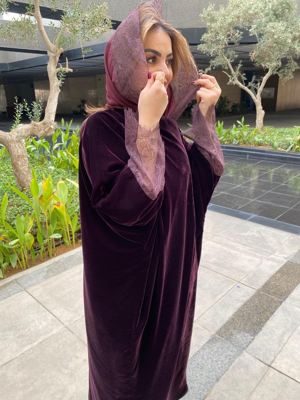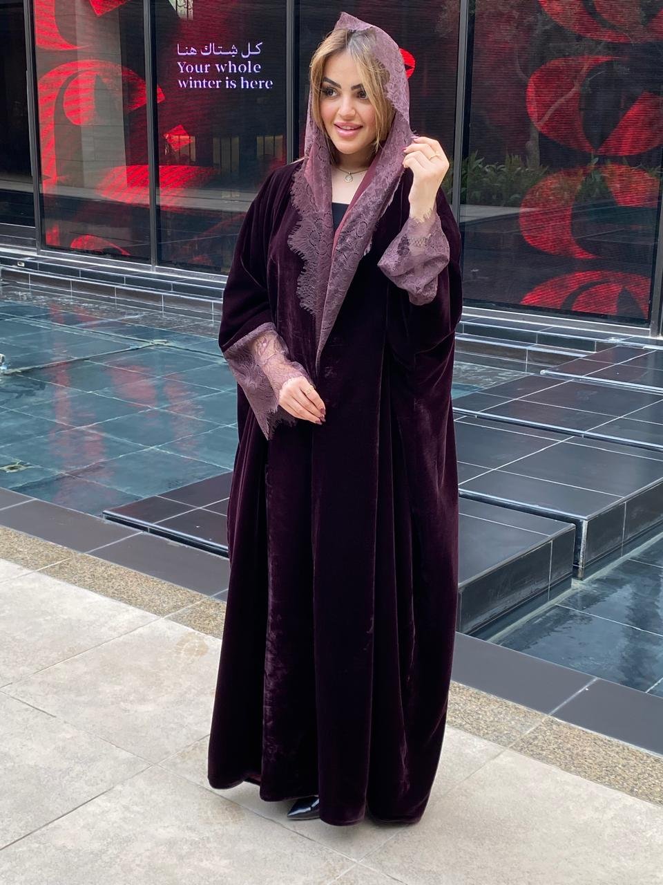 A luxurious velvet abaya accented with elegant lace details,