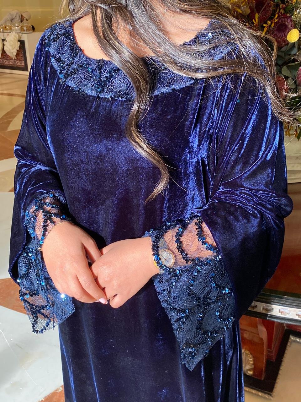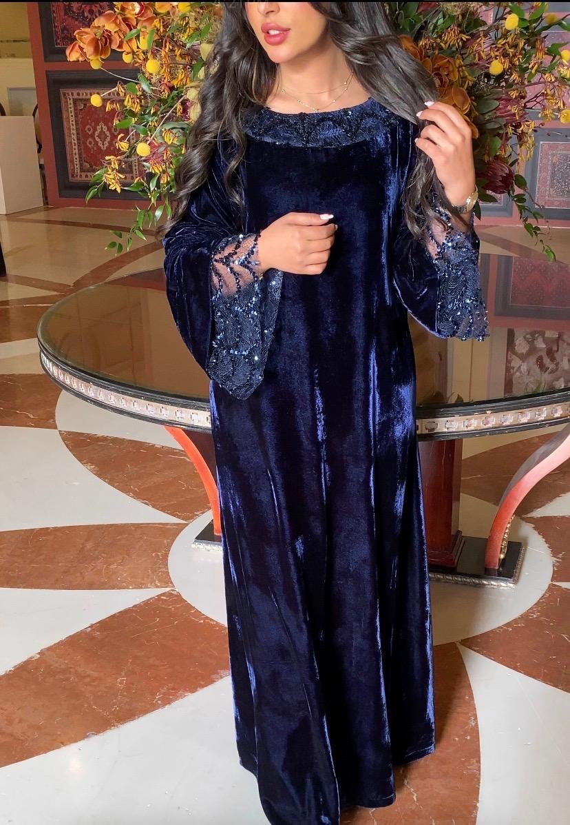 A French velvet jalabiya featuring sequined tulle details on
