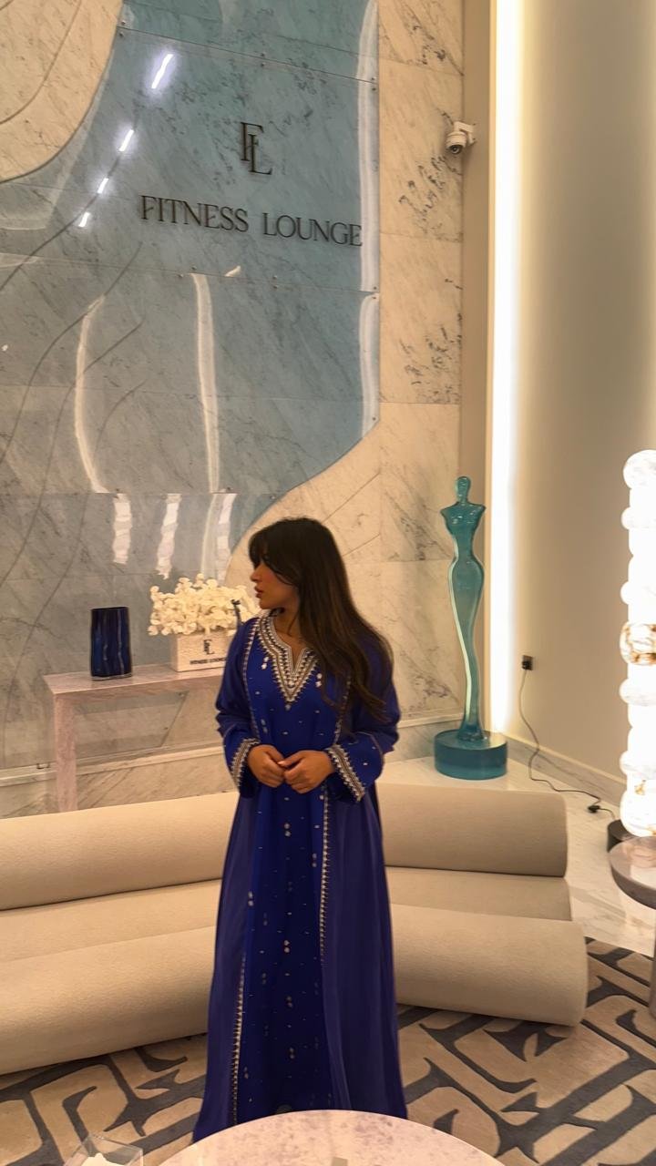 A Pure Silk Naqda jalabiya with optional French velvet, washed silk, or ceramic fabric in a royal blue tone, featuring delicate embroidery for a refined and elegant look perfect for special occasions.
