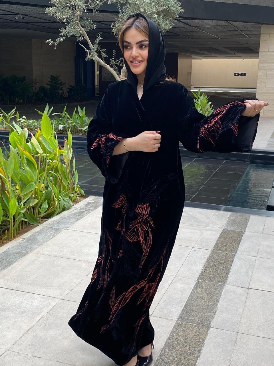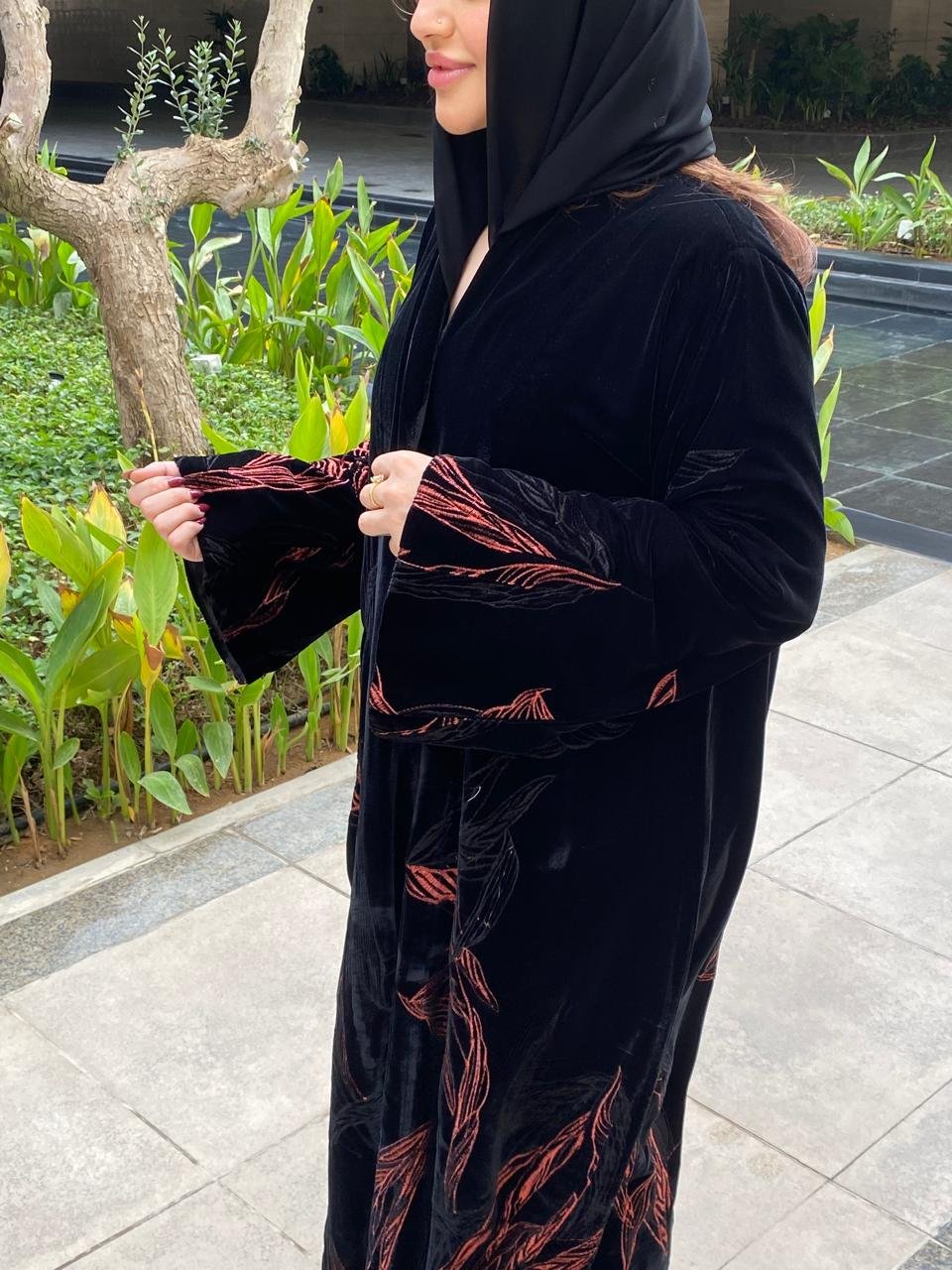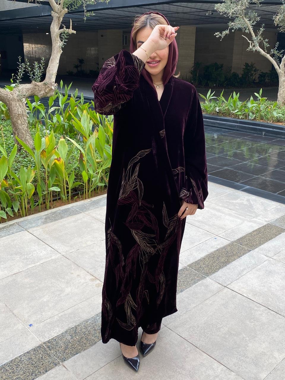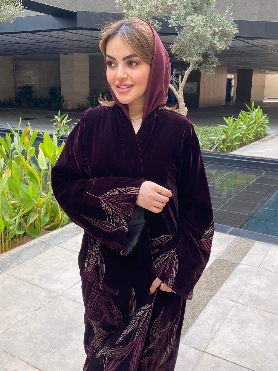 A luxurious velvet abaya adorned with elegant embroidery, in