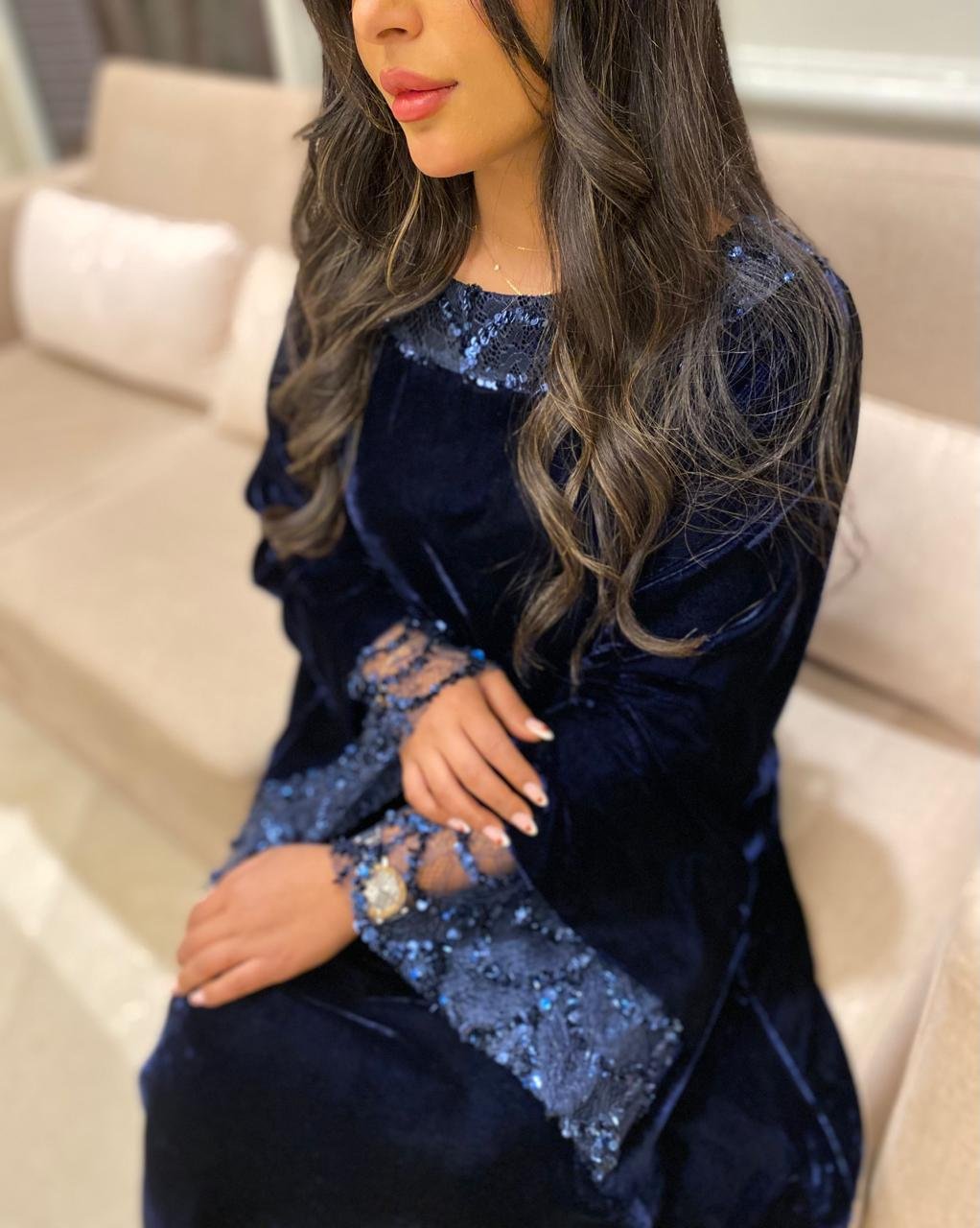 A French velvet jalabiya featuring sequined tulle details on